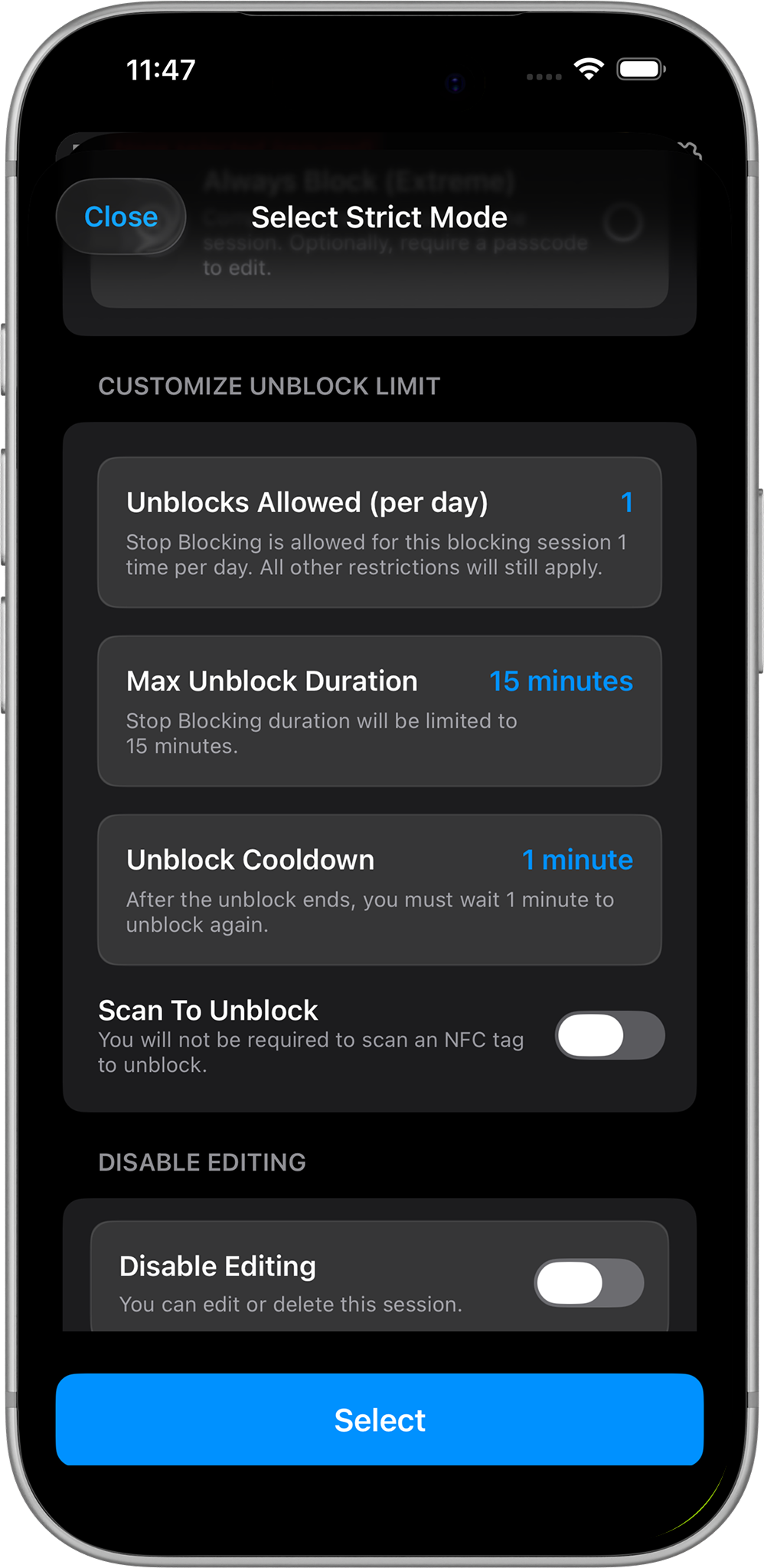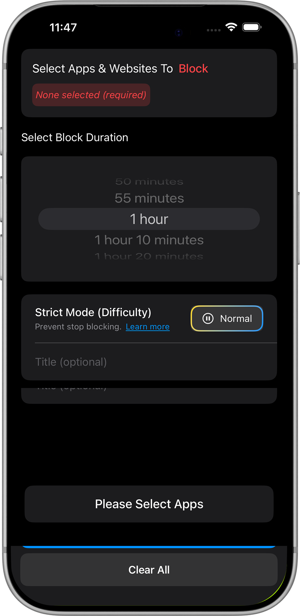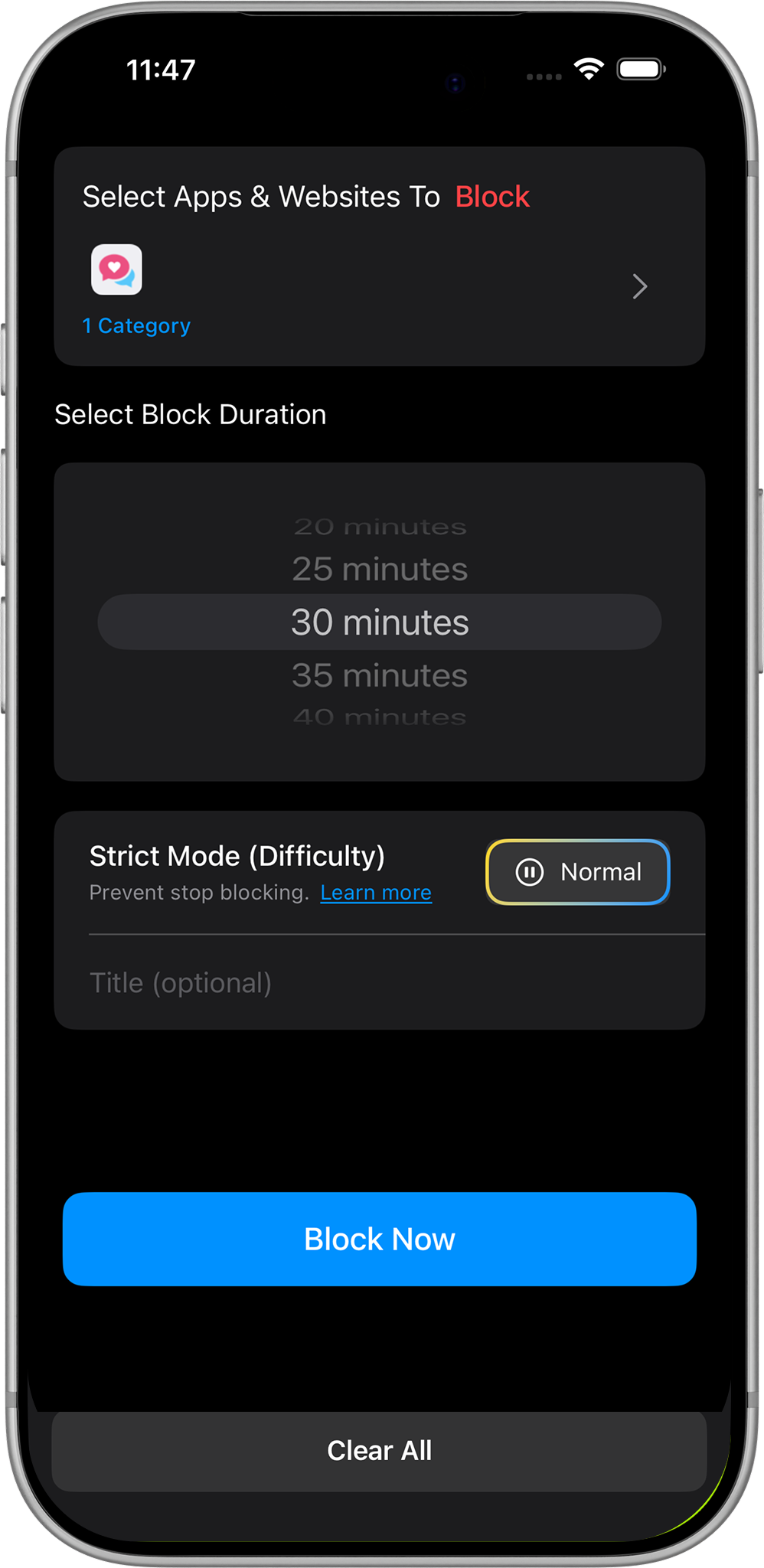 Stop scrolling before it starts. Block distracting apps instantly with a single tap.